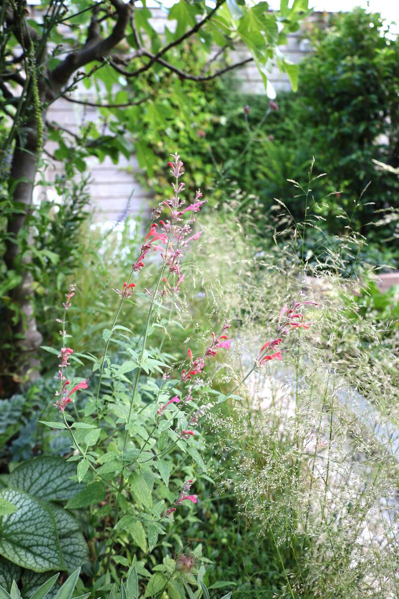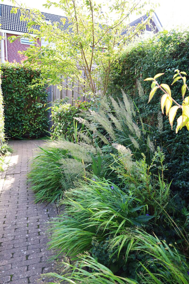Een groene tuin met wuivende siergrassen, een geweldig schaduwhoekje met staptegels, regenton en vooral ontspanning. De tuin is slechts 5 bij 10 meter, maar oogt ontzettend groen.