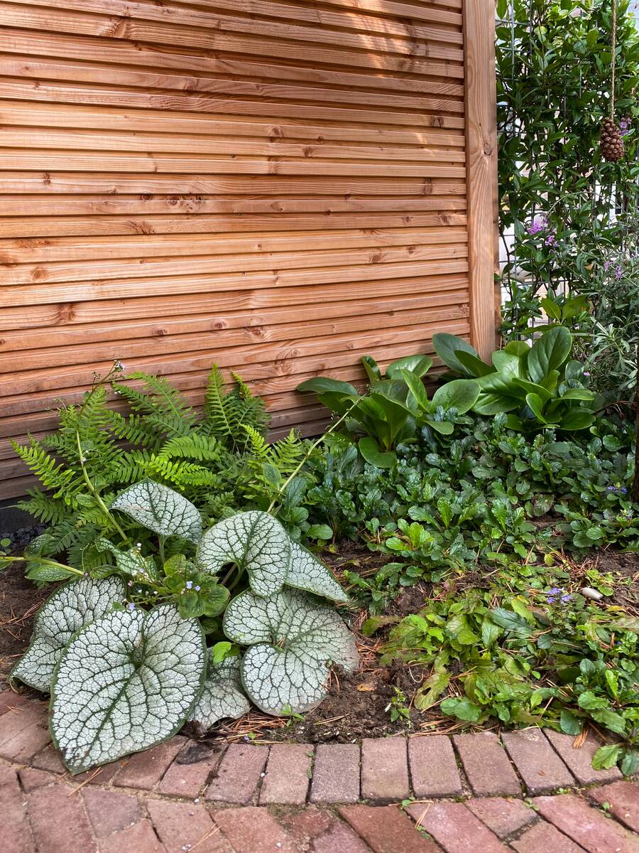 De schuttingen waren net vernieuwd toen ik langskwam voor een tuinontwerp. Omdat het nieuwe hout een sterk boshutgevoel geeft, heb ik die sfeer laten terugkomen in de planten.