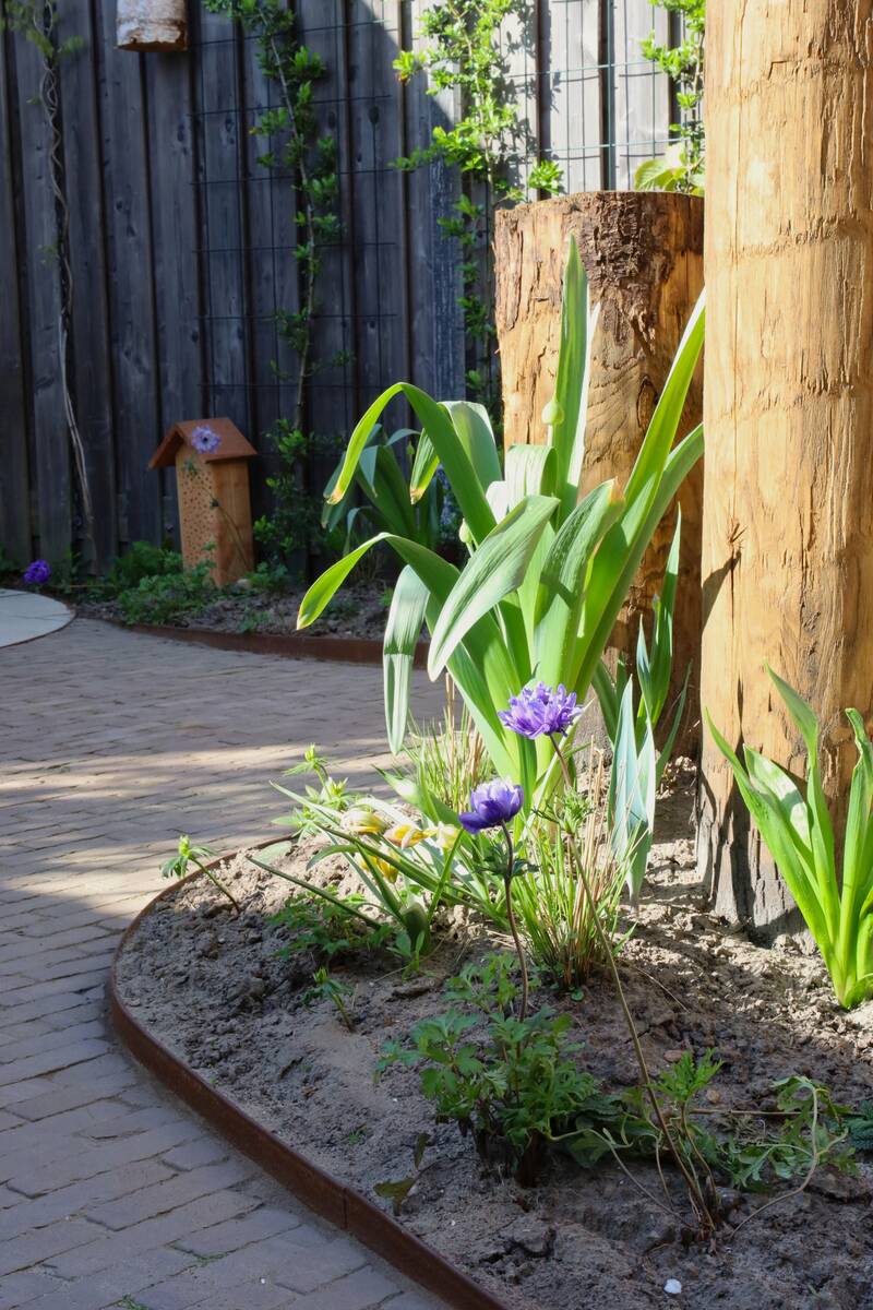 Elk seizoen is er iets te beleven. Het begint met bloembollen en winterbloeiers vanaf de winter en lente. In de zomer volgen prachtige paars-gele bloemen. In de herfst is het volop feest in deze kleine tuin, doordat de vuurdoorn knalt met zijn oranje bessen. De doorns vormen meteen een ideale schuilplek voor vogels.